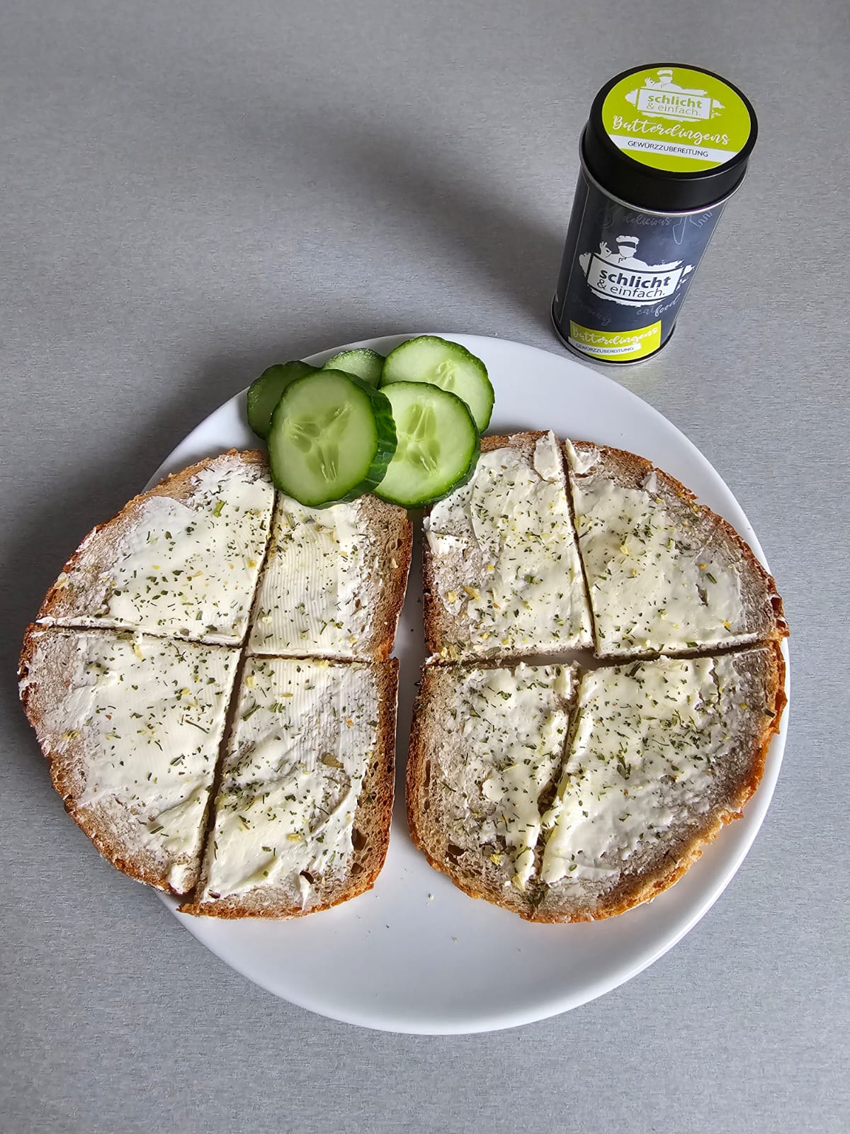 Graubrot mit Butter bestreichen und schlicht & einfach mit Butterdingens würzen. SOOOOO Lecker.
